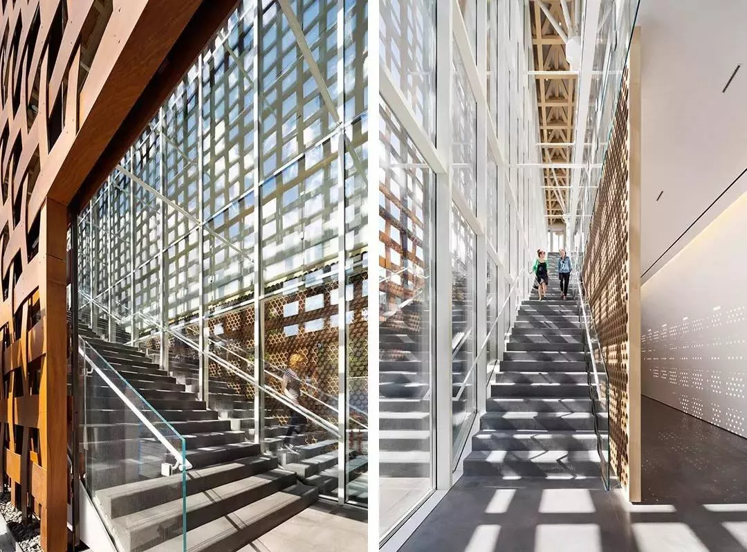 4 木材外表皮:編制的木材外立面籠罩了建筑的兩個主要立面,成為建筑的標(biāo)志,其通透的構(gòu)造讓光與風(fēng)任意游走。特別是光,在博物館的樓梯,走廊和空間中雕琢出動人的光影。