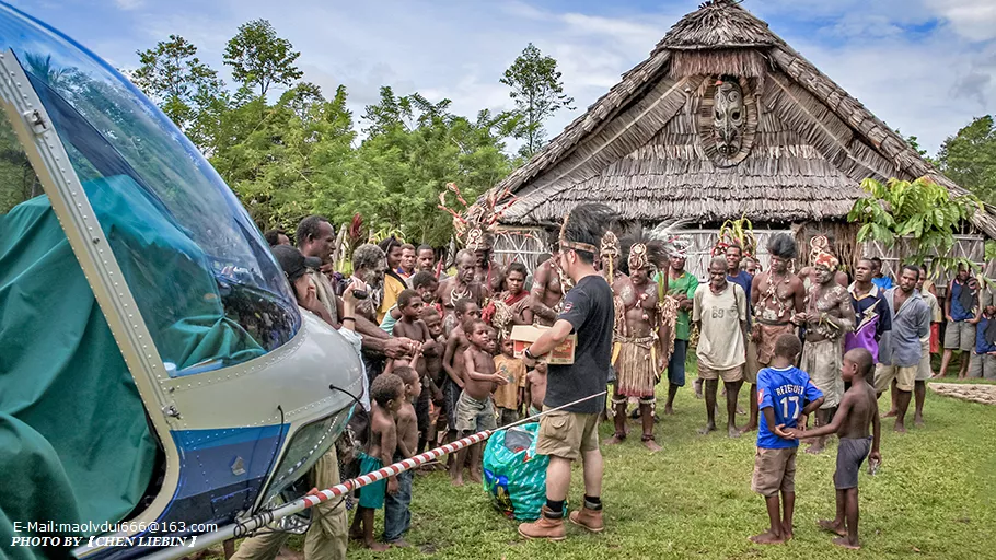 舞蹈結(jié)束后,夢、開始給孩子們分送T恤、鞋子和食品,部落首領(lǐng)拿著兩只雕刻精巧的笛子和一個(gè)木雕面具作為禮物回贈給我們。從到達(dá)村落到離開,度過了一天里最炎熱、也最難忘的兩個(gè)多小時(shí),大家從陌生到熟悉,最后握手、擁抱、拍拍打打就像老朋友。離別的時(shí)刻終于到來,我們還要尋找另一個(gè)村莊。我們知道今生大概率不會再一次來到這里,但我們已經(jīng)是朋友。相信他們在以后的生活里,一定會常常提起那架從天而降的藍(lán)色直升飛機(jī),那些中國人……