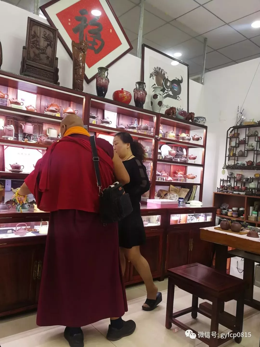 先來到青年陶藝家袁麗萍的藝術(shù)館游覽。這里琳瑯滿目,高中檔俱全。在我參觀后和小袁聊天的時候,進來一位她的老朋友,在青海出家的喇嘛健旺大師也來選購紫砂壺。在我的