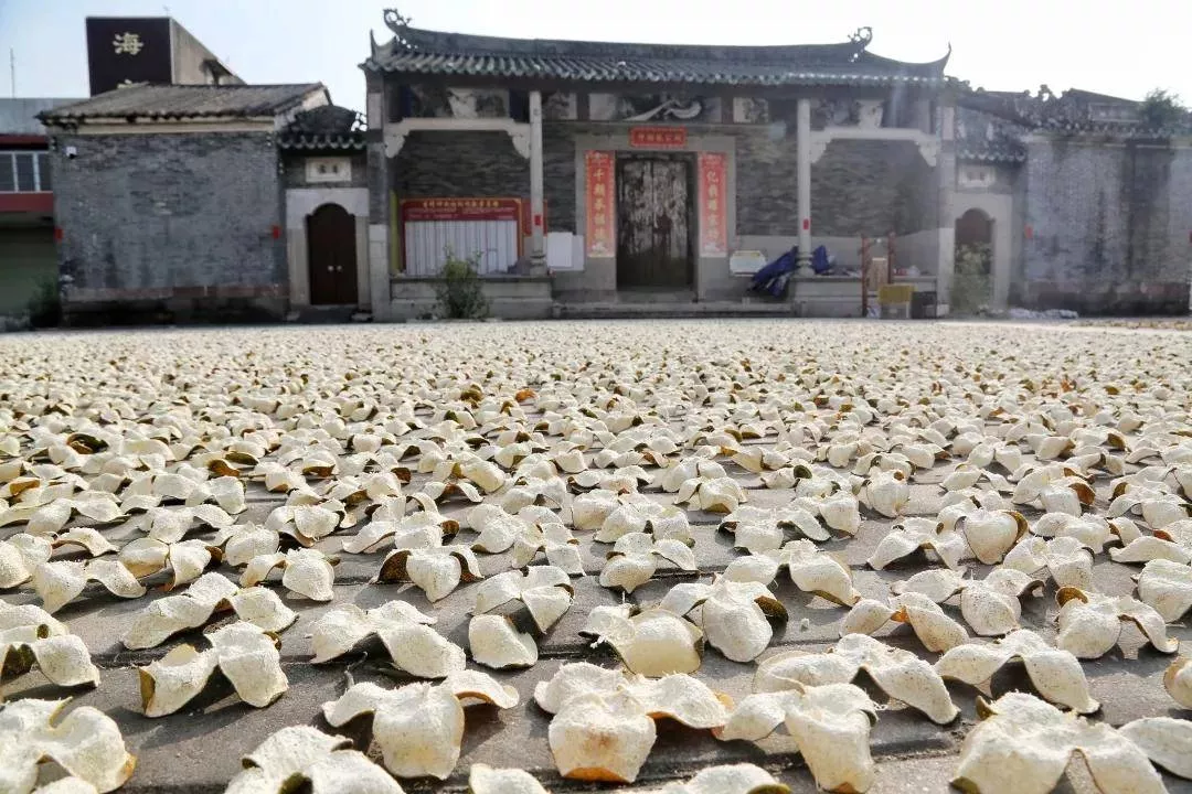 以陽光自然生曬的陳皮,靜待歲月陳香,走在新會(huì)的村落之間,可以說,有陽光照射到的地方,就總能見到當(dāng)?shù)厝嗽谌齼蓛傻厣鷷耜惼ぃ@是他們幫補(bǔ)家計(jì)的一種途徑,這更是家家戶戶的日常。