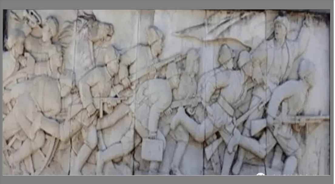 底座為灰色花崗巖砌成,上有栩栩如生的四幅浮雕;正面的圖案是飛奪瀘定橋,兩側(cè)為東北抗聯(lián)抗擊日寇和遼西追擊戰(zhàn),后面是解放平頂山戰(zhàn)斗。碑身呈凹型,正下方有麥穗和齒輪石透雕花環(huán)。