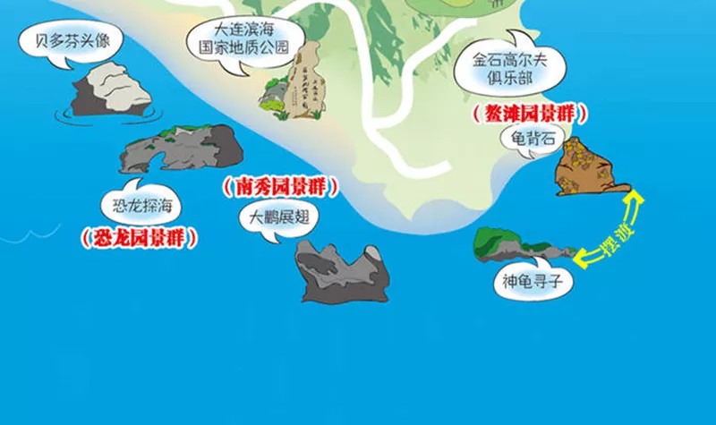 藍色的海水清澈見底,與碧海相接一線。三面環(huán)海,冬暖夏涼,氣候宜人,凝聚了3-9億年地質(zhì)奇觀,有“神力雕塑公園”之美譽。主要景點黃金海岸、金石園濱海地質(zhì)公園、金石蠟像館、生命奧秘博物館、發(fā)現(xiàn)王國等??胺Q大連的“后花園”。