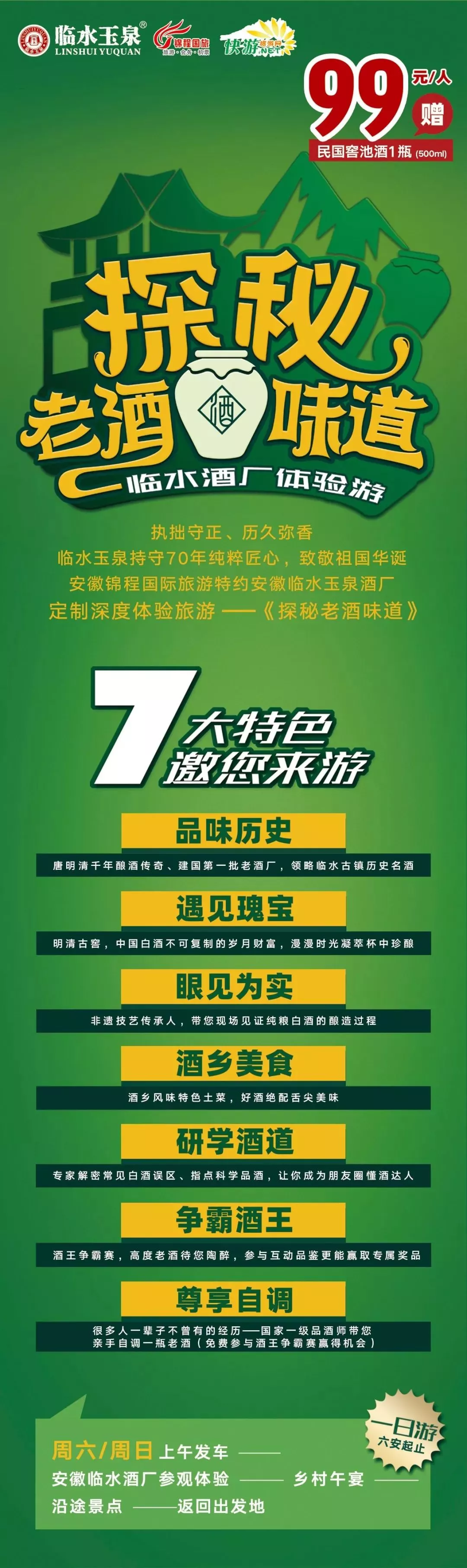 日期:11月2日/3日名額:限額50名/班價格:99元/人(含中餐)贈品:1瓶民國窖池酒(500毫升)行程安排早上六安指定地點集合前往霍邱臨水酒廠,在酒廠政務講解員的帶領下參觀、探秘、深度體驗,開展品酒比賽,解密常見白酒誤區(qū),開展“酒王爭霸”,獲獎人員在國家一級品酒師指導下親自調酒(獎品)。中餐后贈送參觀朱元璋年少出家地——臨水圓覺寺、李氏莊園“李家圩子”(修繕期間只能