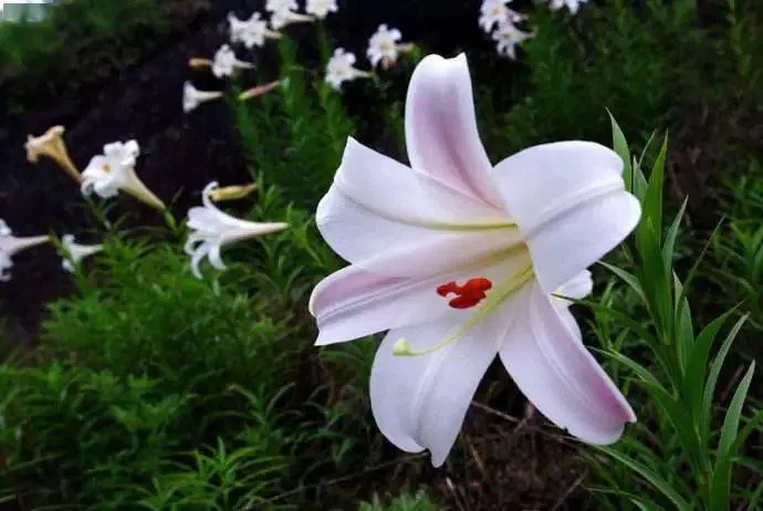 野百合,花朵潔白、芳香,花喇叭形,外面稍帶紫色,無斑點,向外張開或先端外彎而不卷。蒴果矩圓形,有棱,具多數(shù)種子。