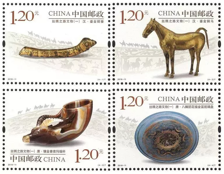 絲綢之路就像一條紐帶,將中國(guó)與世界緊緊聯(lián)系在了一起,極大地促進(jìn)了中西方商貿(mào)的發(fā)展與文化的交流,在開(kāi)放和包容中創(chuàng)造了不朽的文明成果。絲綢之路沿線出土的文物可謂是東西長(zhǎng)期交流與融合的最好見(jiàn)證。《絲綢之路文物(一)》郵票展現(xiàn)了古代陸上絲綢之路起點(diǎn)陜西省出土的四件代表性絲路文物。