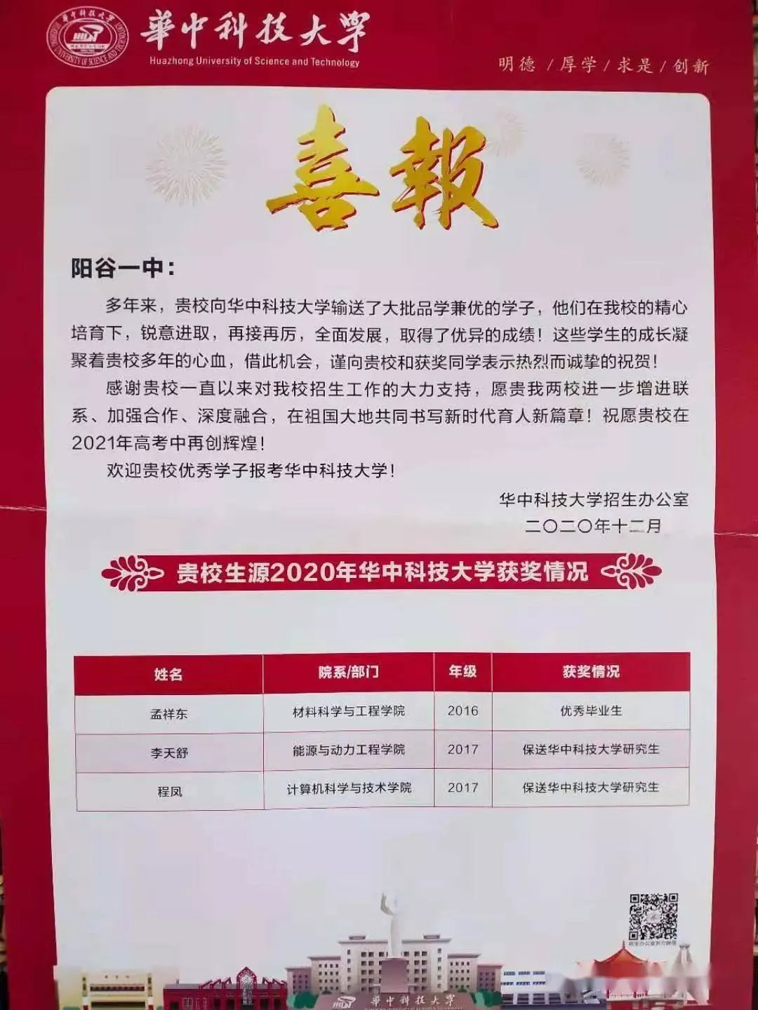陽(yáng)谷縣教育和體育局公眾號(hào)近日,陽(yáng)谷一中收到華中科技大學(xué)發(fā)來(lái)的喜報(bào),感謝陽(yáng)谷一中多年來(lái)一直為其輸送優(yōu)秀學(xué)子。喜報(bào)稱,近年來(lái)陽(yáng)谷一中向華中科技大學(xué)輸送了大批品學(xué)兼優(yōu)的學(xué)子,他們?cè)谌A中科技大學(xué)的精心培育下,銳意進(jìn)取,再接再厲,全面發(fā)展,取得了優(yōu)異的成績(jī)!其中,孟祥東同學(xué)榮獲“優(yōu)秀畢業(yè)生”稱號(hào),李天舒、程鳳2位同學(xué)保送華中科技大學(xué)研究生。這些學(xué)生的成長(zhǎng)凝聚著陽(yáng)谷一中多年的心血,借此機(jī)會(huì),謹(jǐn)向陽(yáng)