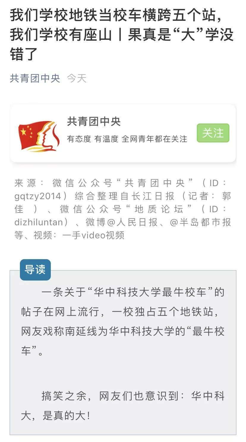 關(guān)注武漢地鐵2號(hào)線南延線于2月19日開(kāi)通試運(yùn)營(yíng)2月20日#華中科技大學(xué)最牛校車#這一話題就喜提《人民日?qǐng)?bào)》官博關(guān)注報(bào)道2月22日又喜提共青團(tuán)中央官微關(guān)注報(bào)道還躥上了百度和新浪微博兩大熱搜榜單網(wǎng)友們各種羨慕嫉妒恨紛紛感慨華中科技大學(xué)到底有多大?下面就讓武小青來(lái)為大家“量一量”華中大≈0.05平方毫米一支筆尖的面積約是0.05