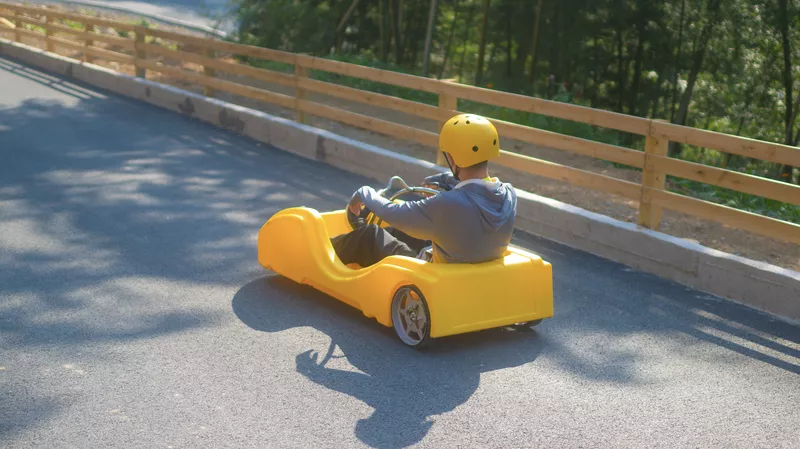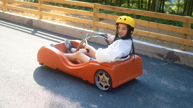 坐在滑板小車上,實現(xiàn)高速行駛,體驗速度與激情和山峰的呼嘯~當然啦,害怕的朋友們可以輕捏手剎降低速度哦!