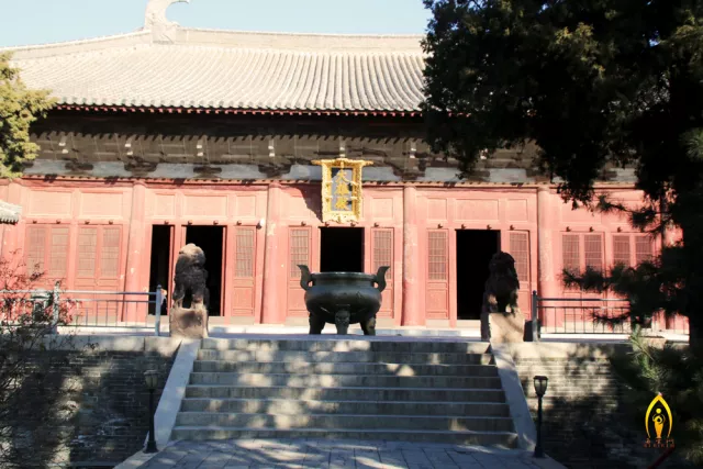 繼續(xù)前行是天王殿,為單檐歇山頂,面闊三間,進深兩間,通面闊16.14米,通進深12.22米。始建于金代天眷三年(1141年),原名萬壽殿,后改為無量殿,清康熙四十九年(1710年)重修。近代按照漢傳寺院傳統(tǒng)格局為依據(jù),更名為天王殿。