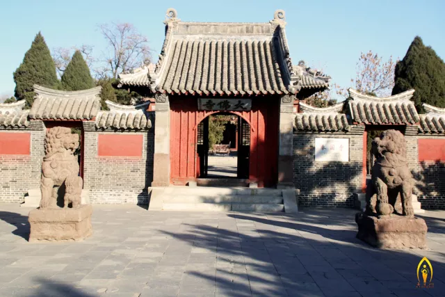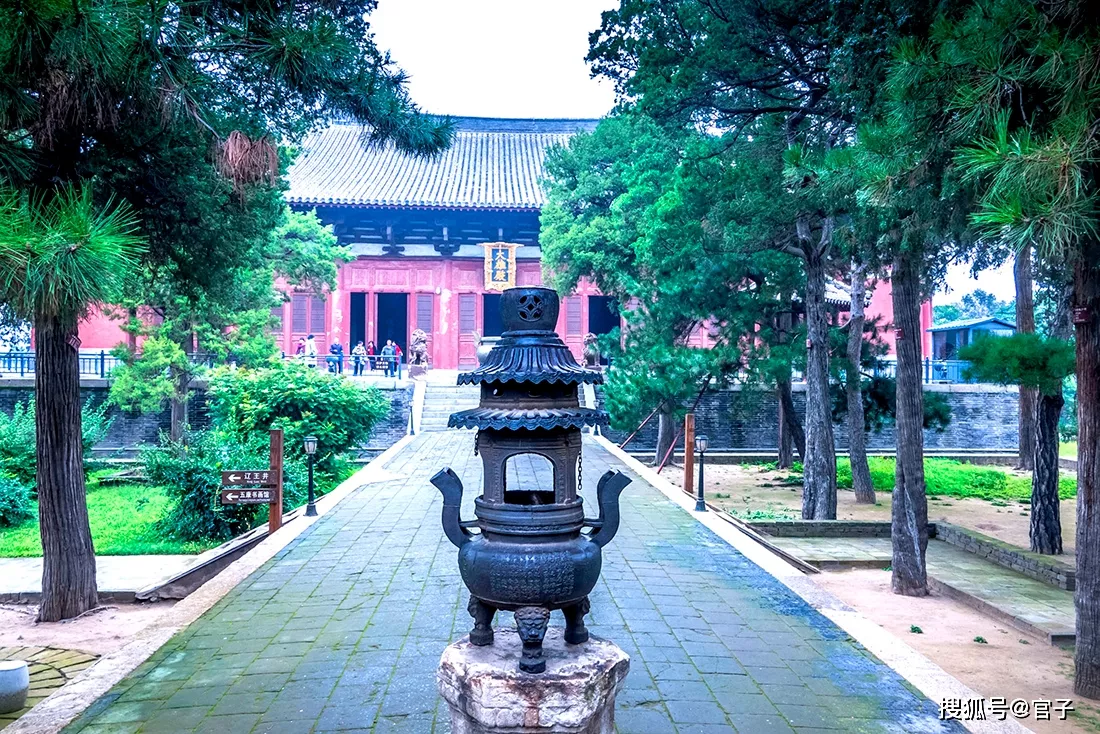 步入景區(qū),進入視野的是層次錯落的古建筑,前面的山門、牌坊、天王殿均為明清建筑風格,最高大的那棟古建筑與前面的建筑風格明顯不一樣,尤其是巨大的飛檐斗拱,頗有《詩經(jīng)·小雅·斯干》中“如鳥斯革,如翚斯飛”的風采,氣宇軒昂,一下子就吸足了眼球。