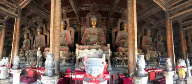大雄殿是中國古代建筑中最大的單層木結構建筑,被譽為“中國第一大雄寶殿”。大雄殿筑于高3米的臺基之上,為五脊單檐廡殿式,面闊九間,長48.2米,進深五間,寬25.13米,高達21米,建筑面積1829平方米,是佛教頂級建筑,殿內(nèi)主供七尊大佛為原汁原味的遼代塑像,由東至西依次為迦葉佛(貴人佛、成就佛)、拘留孫佛(平安佛)、尸棄佛(健康佛)、毗婆尸佛(興業(yè)騰達佛、智慧佛)、毗舍浮佛(招運佛、發(fā)財佛)、拘那含牟尼佛(光明佛)、釋迦牟尼佛(佛教創(chuàng)始人),七佛皆端坐于須彌座上,通高9米以上。尤以正中的毗婆尸佛最高,合座高達9.5米。因“過去七佛”并列一堂,佛祖釋迦牟尼偏居其中,為佛教界獨一無二。另外,每 尊佛前左右各有一脅侍菩薩相對而立,高2.5米,共14尊。諸菩薩或仰或俯,或斜立或平視,兩足踏蓮花一朵。寶相莊嚴,栩栩如生。