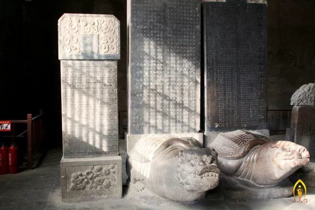 進門后東側(cè)有一間殿名為中華名匾展室,專門安放三塊大匾,分別為“大雄殿”“法輪天地”“慈潤山河”。三塊匾制作于乾隆五年(1740年),木制豎形,龍邊(凡六龍),有專家論證字跡為乾隆筆跡。三塊匾原放在正殿檐下,現(xiàn)在已用復制品替換。