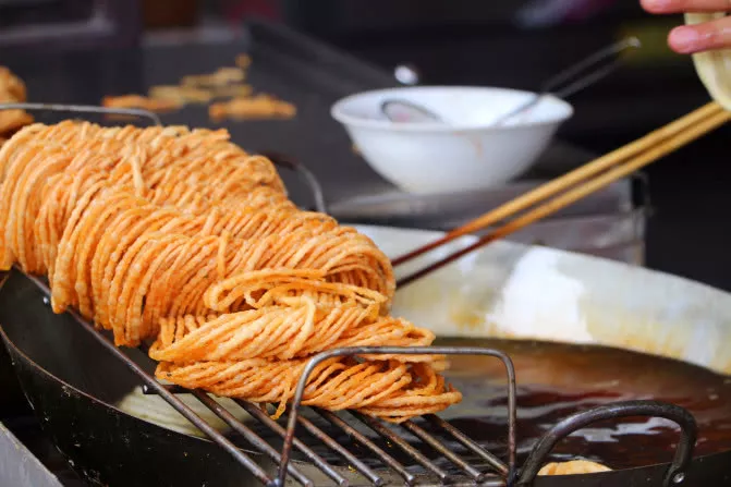 河下古鎮(zhèn)的石板街上,除了巷口有幾家做“茶馓”的小店,幾乎見(jiàn)不到其他商鋪?!安桠獭币矠榛窗伯?dāng)?shù)氐?a href='/tutechan/' target=_blank>土特產(chǎn),已有百年的歷史了,“鮮不過(guò)雜碎,香不過(guò)茶馓”,是老淮安人念念不忘的美食。這種用面粉油炸制作的食物,因香軟可口易消化,從前也是女人做“月子”時(shí)的必備食物。