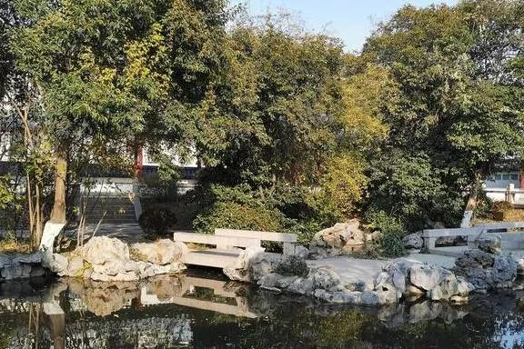 乾隆行宮的東側(cè),是一處仿江南園林的碑園,湖水四周為復(fù)古回廊,清幽典雅的古代園林式建筑,小橋流水,這里最適合拍照打卡之地