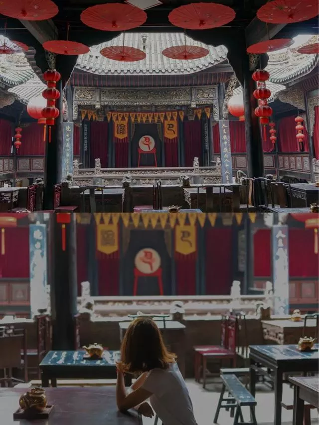 談及重慶會(huì)館的第二大看點(diǎn),就是金碧輝的廣東公所了。廣東公所又名南華宮,始建于康熙年間,整個(gè)建筑呈現(xiàn)的是四合院的特點(diǎn)。四側(cè)高墻聳立,中間的一個(gè)偌大的戲臺(tái)。這里有著整個(gè)公館中最精妙絕倫的板雕,上面雕刻著《西游記》、《西廂記》的經(jīng)典故事。這里更保留著先前的喝茶看戲的戲臺(tái)茶坊,引來很多游人在此看戲喝茶,打發(fā)時(shí)間。一時(shí)間,有一種穿越回民清時(shí)期的感覺。因此,也有不少新婚燕兒,選擇在這里拍婚紗照,記錄他們的幸福時(shí)光。