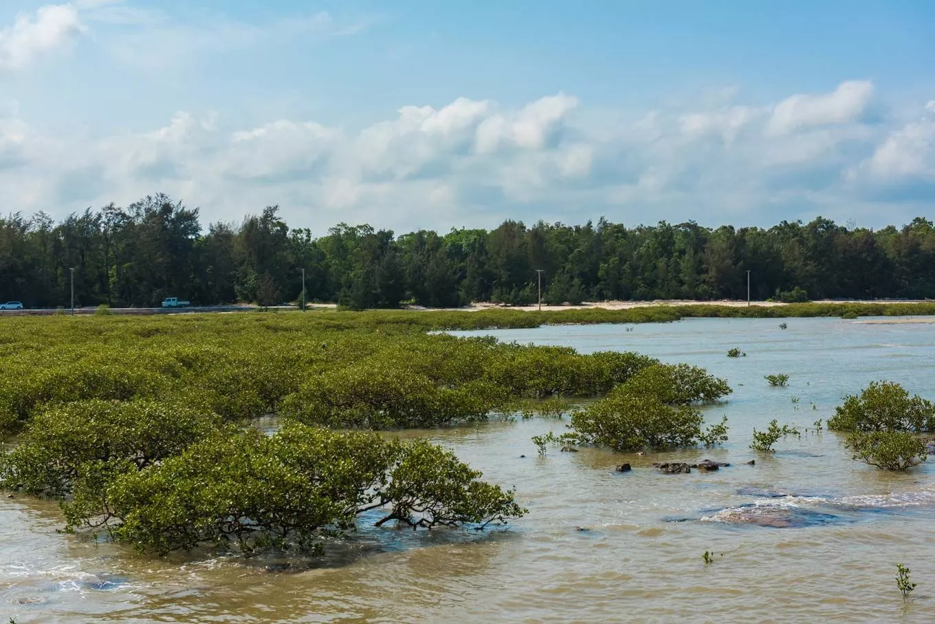 沿著棧道慢慢向前,蔚藍(lán)色的天空,海風(fēng)輕輕的吹拂,一眼望去,無(wú)邊無(wú)際, 水里還種植了大片紅樹(shù)林。