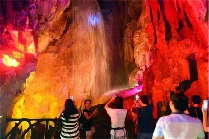 漸漸走入溶洞深處,越來(lái)越大的水聲環(huán)繞在耳邊,聞聲尋去,眼前所見(jiàn)之景讓人贊嘆不已。只見(jiàn)如薄紗般平整鋪開(kāi)的水簾順著巖壁,傾瀉而下,由于燈光的作用,更顯得美輪美奐。這就是著名的地下瀑布景點(diǎn),親眼目睹,果然名不虛傳。