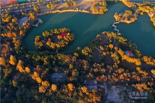 11月3日,深秋時(shí)節(jié)的張掖市高臺(tái)縣月牙湖公園,金柳垂似簾,湖面平如鏡,百米高空下俯瞰宛如一幅繪制在黑河濕地上的濃艷水彩畫(huà)卷。