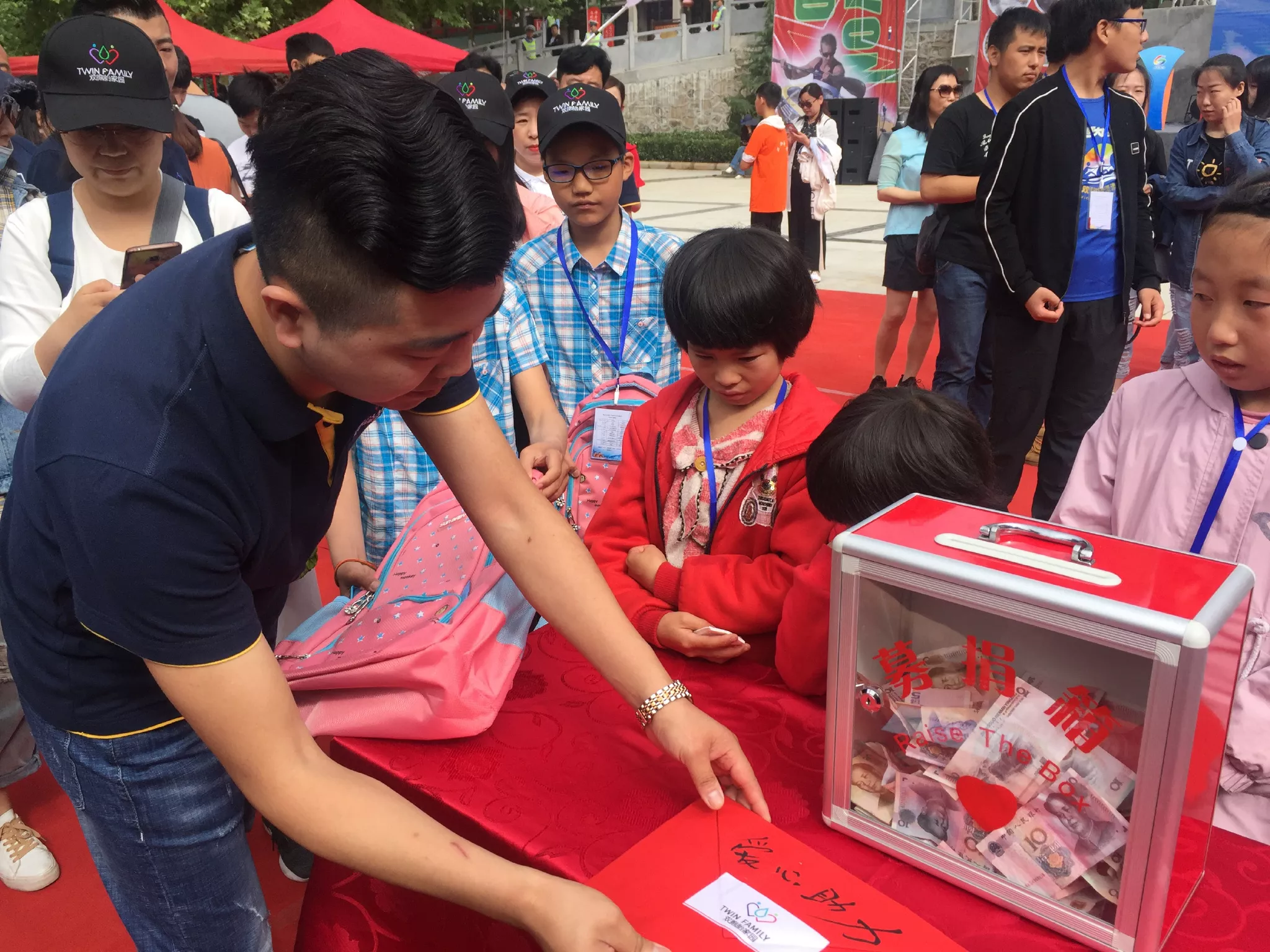 生活中常有感動(dòng),雙胞胎們聽說他們之中有幾對(duì)雙胞胎家庭非常貧困,就自發(fā)組織起來,為來自盧氏縣官道口車嶺村的的8歲雙胞胎馮婷婷、馮瑩瑩,和來自官道口郭念村的9歲郭佳怡、郭佳悅,兩姐妹獻(xiàn)愛心,在場(chǎng)的雙胞胎和來自全國(guó)的游客便為這四個(gè)貧困的雙胞胎主動(dòng)獻(xiàn)愛心,捐贈(zèng)了書包、鉛筆盒、課外書籍、衣服等物資,學(xué)習(xí)桌等。最后,本次活動(dòng)在“第十二屆全國(guó)雙胞胎漂流節(jié)”的頒獎(jiǎng)儀式中圓滿落幕。