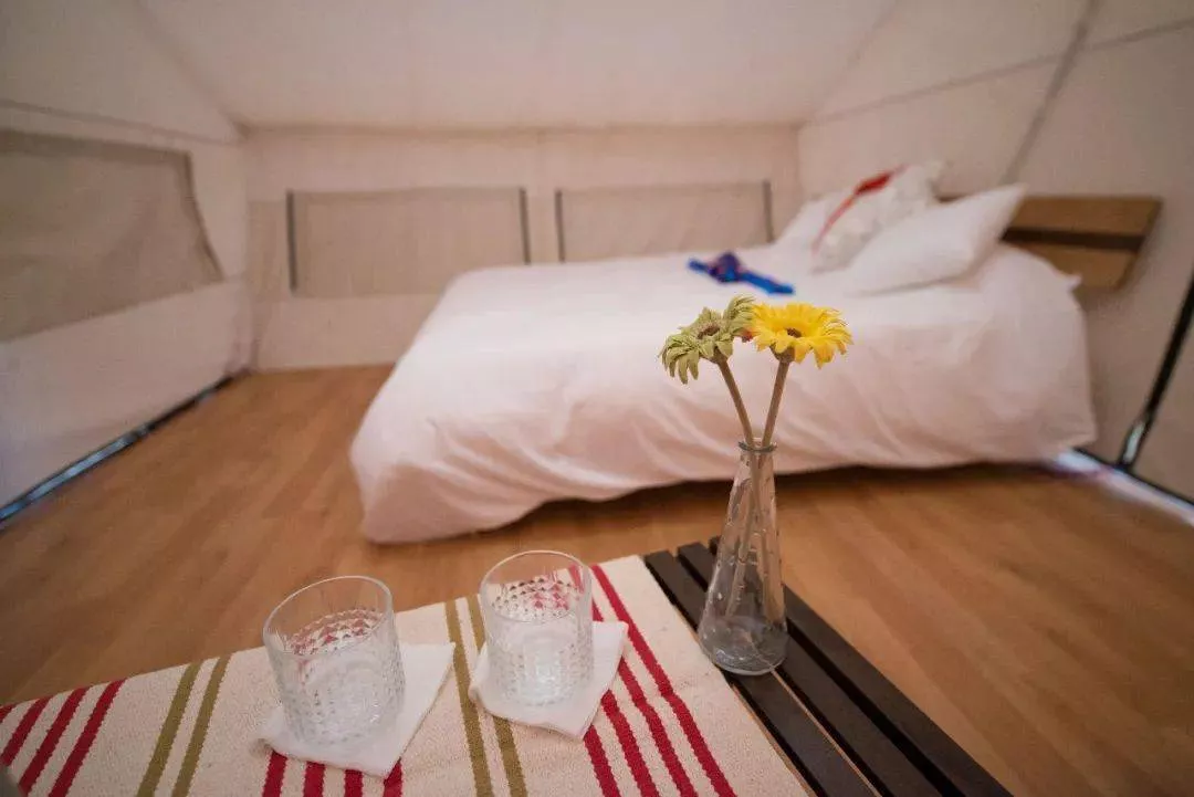 還有地毯、抱枕、小茶幾,新鮮的花束作為裝點(diǎn),帳篷的側(cè)邊和頂部也有可以開合的觀景窗,可以看星星、吹晚風(fēng),隨時(shí)就可以與大自然融為一體,清新自然卻又處處流露出度假村的用心。