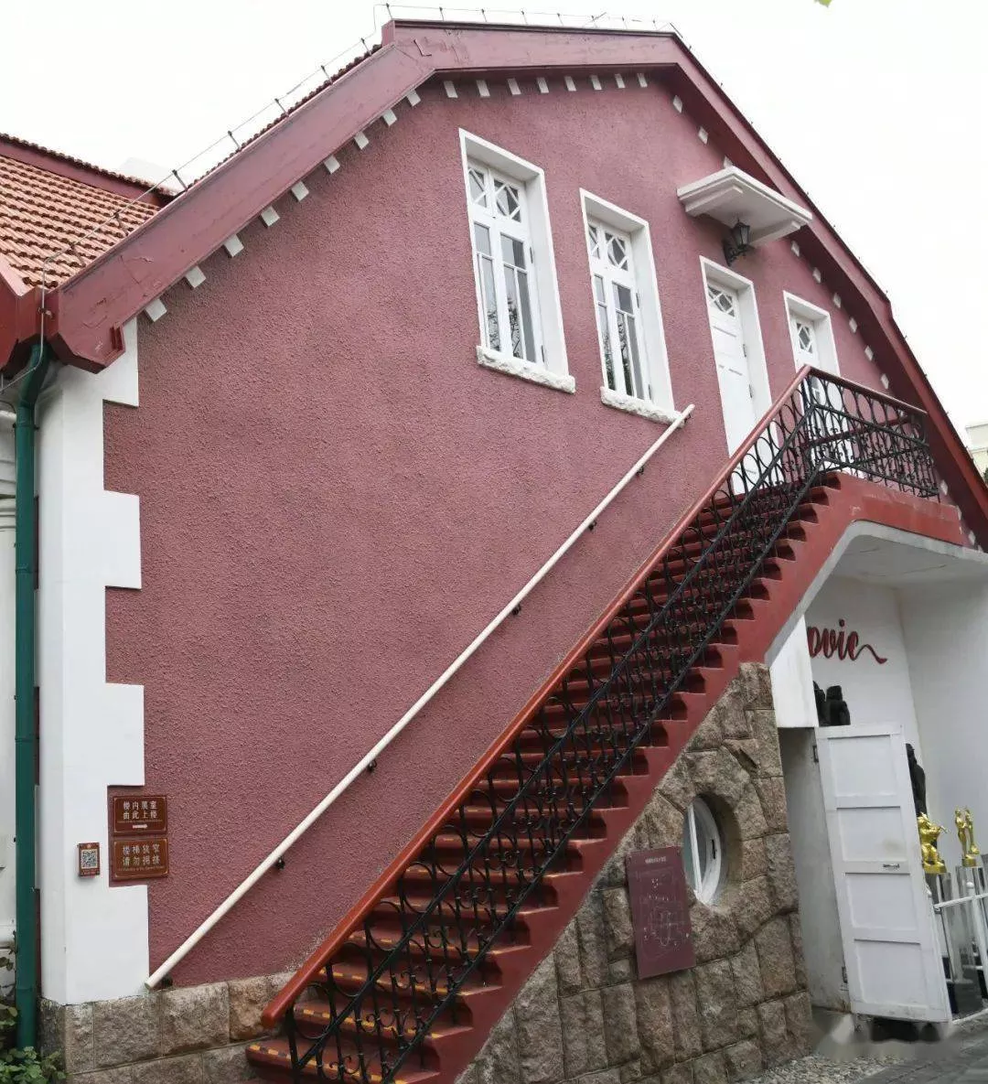 磚紅色墻體匹配白色的門窗、立柱、陽臺(tái)和轉(zhuǎn)角裝飾,讓這座連同院落只有843平方米的別墅,更顯明快亮麗。據(jù)說蝴蝶樓出自中國建筑師劉耀辰與俄國建筑師拉夫林且夫的合璧設(shè)計(jì),屬于折中主義建筑,也就是不講求固定法式,只重純粹形式之美的建筑風(fēng)格。在這樣一座不拘一格的現(xiàn)代老建筑中,青島與電影的故事綿延近百年,同樣不拘一格。