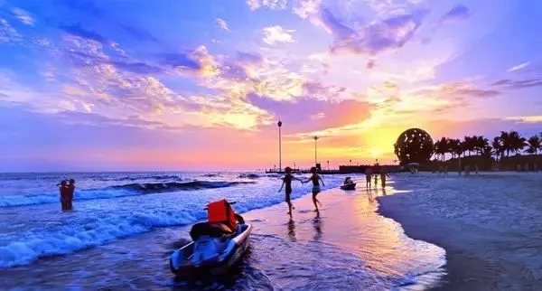 以灘長(zhǎng)平、沙細(xì)白、水溫凈、浪柔軟、負(fù)氧離子高、