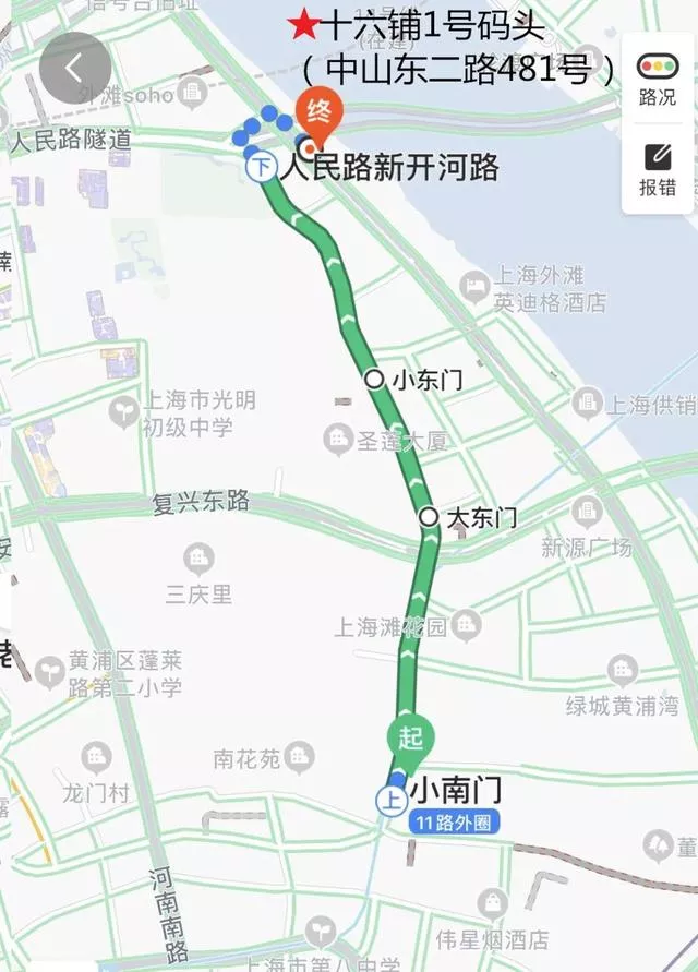 可在公交車站小南門站換乘11路外圈,至人民路新開河路站,步行300多米至十六鋪1號碼頭登船點