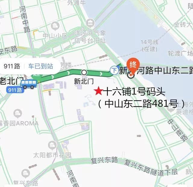 可在公交車站老北門站換乘911路至新開河路中山東二路站,步行200多米至十六鋪1號碼頭登船點