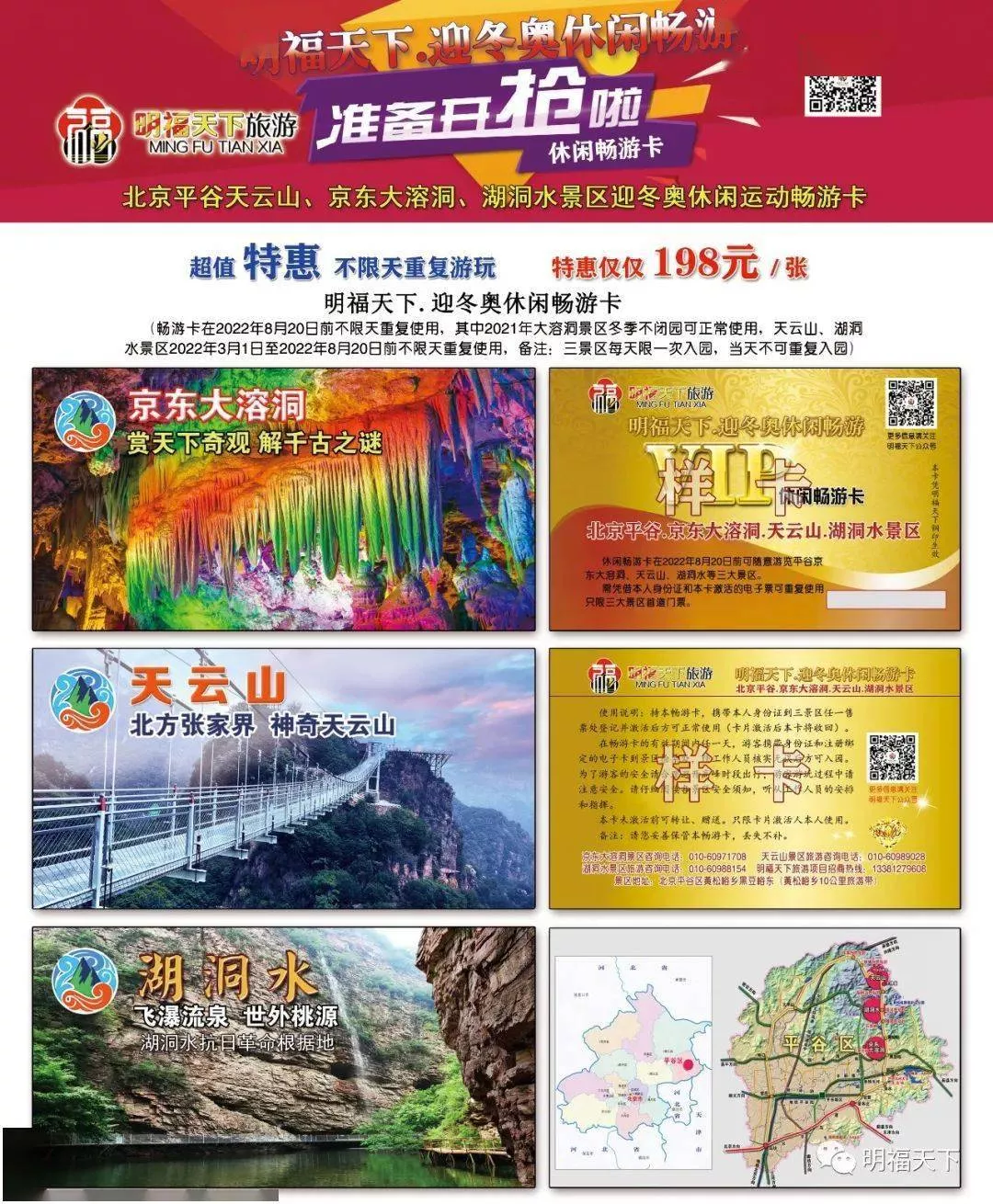 明福天下·迎冬奧休閑暢游卡,在2022年8月20日前本人不限天可重復(fù)使用,主要為平谷京東大溶洞、天云山、湖洞水三景區(qū)的可多次重復(fù)入園門票。