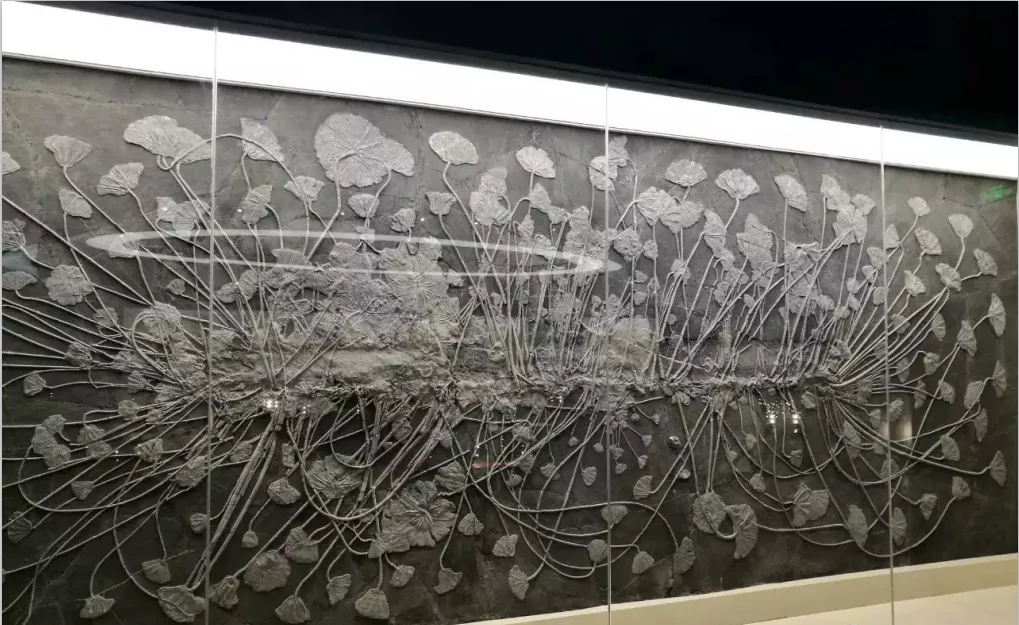 走進(jìn)博物館,首先被他獨(dú)特的設(shè)計(jì)風(fēng)格吸引——序廳的巖石造型墻“大別山地質(zhì)博物館”,底層巖石造型以TTG巖系與高壓超高壓榴輝巖為裝飾,上層裝飾墻面以花崗巖為裝飾。