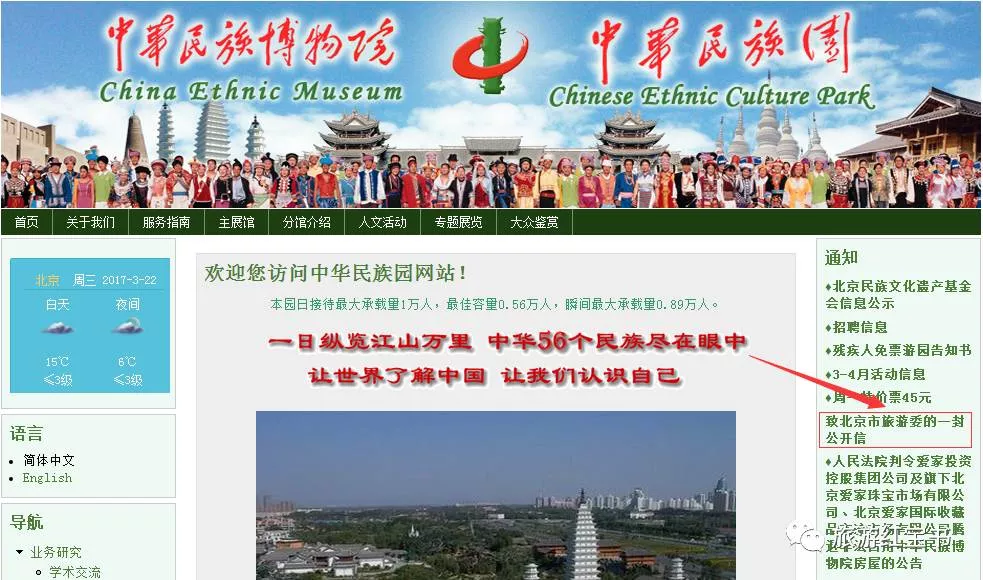12月6日,北京中華民族園在其官網(wǎng)首頁發(fā)布了《致北京市旅游委的一封公開信》(現(xiàn)已放到右側(cè)通知欄里)。