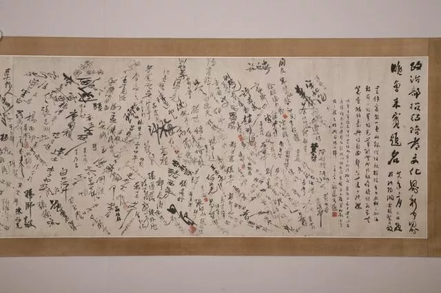 紙質(zhì)72厘米。1983年翁植耘捐贈(zèng)。1940年11月1日,國(guó)民政府政治部所屬“文化工作委員會(huì)”在 重慶 通遠(yuǎn)門(mén)天官府正式成立,根據(jù)周恩來(lái)“要造一個(gè)聲勢(shì),以顯示我們的力量”的指示,以郭沫若為首的文工會(huì)領(lǐng)導(dǎo)層決定于11月7日晚在純陽(yáng)洞中古電影制片廠 新建 的“抗戰(zhàn)建國(guó)紀(jì)念堂”(抗建堂)舉辦一次盛大的招待會(huì),籍以擴(kuò)大抗日救國(guó)的宣傳和影響。當(dāng)晚嘉賓陸續(xù)到場(chǎng),受邀請(qǐng)的來(lái)了,沒(méi)受邀請(qǐng)的也來(lái)了,空曠的大廳轉(zhuǎn)眼間顯得十分擁擠。到場(chǎng)的嘉賓相繼在門(mén)口設(shè)立的簽名臺(tái)上簽名。據(jù)統(tǒng)計(jì),當(dāng)天曾在簽名軸上簽名的人有327人,簽名無(wú)法辨認(rèn)有9人,名字不完整有29人,總數(shù)共365人。這幅簽名軸此后一直掛在文工會(huì)辦公所在地天官府的客廳墻上,陪伴人們度過(guò)了近四年的艱難歲月,成為文工會(huì)成立及活動(dòng)的重要?dú)v史見(jiàn)證。