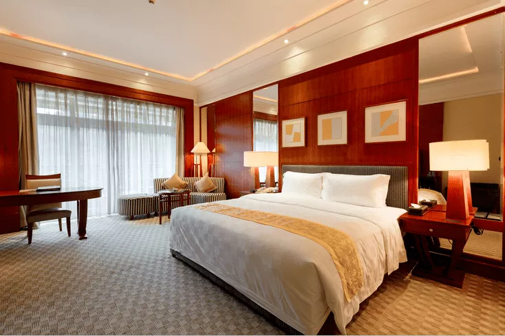 房間設(shè)計(jì)寬敞舒適,客房面朝湖景