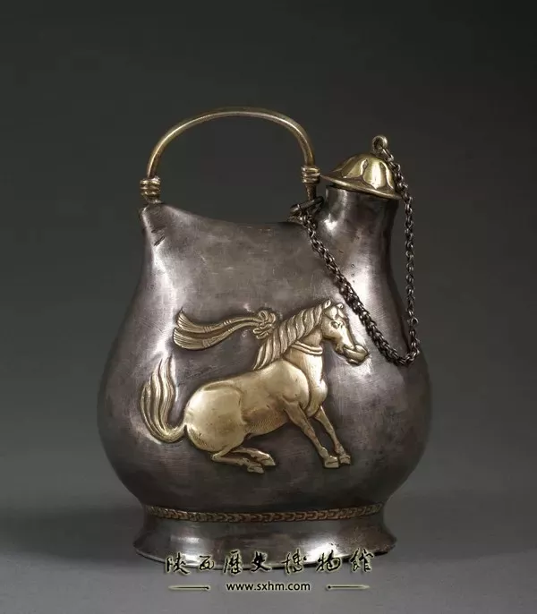 壺的造型采用的是我國北方游牧民族皮囊的形狀,壺身為扁圓形,一端開有豎筒狀的小口,上面置有覆蓮瓣式的壺蓋,壺頂有銀鏈和弓形的壺柄相連。這種形制,既便于外出騎獵攜帶,又便于日常生活使用。銀壺的兩側(cè)采用凸紋工藝各塑造出,一匹奮首鼓尾、躍然起舞的駿馬,表現(xiàn)了唐代工匠在設(shè)計上的獨具匠心。