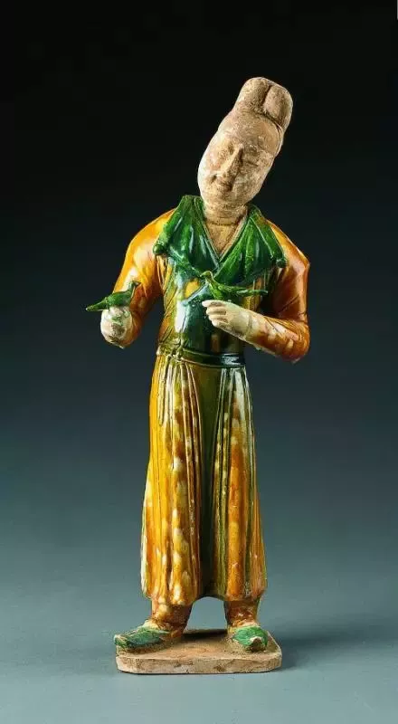 頭戴幞頭,微向左偏,面目清秀,身著翻領(lǐng)胡服,腰系帶。雙手各持一小鳥作調(diào)耍狀,足穿尖頭長靴。通體施釉,色彩鮮艷,形象悠閑瀟灑,調(diào)戲小鳥時喜形于色的神態(tài)得到了充分的體現(xiàn)。反映了當(dāng)時多姿多彩的生活內(nèi)容,具有濃郁的時代氣息。