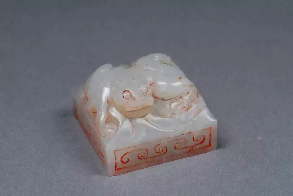 玉色純凈無瑕,晶瑩潤澤,玉質(zhì)堅硬致密,無任何受沁現(xiàn)象。璽體為正方形,鈕為高浮雕的匐伏之螭虎,螭虎形象兇猛,體態(tài)矯健,四肢有力,雙耳后聳,尾部藏于云紋之中,背部陰刻出一條較粗的隨體擺動的曲線。璽臺四側(cè)面呈平齊的長方形,并琢出長方形陰線框。因出土地點距漢高祖和呂皇后合葬的長陵約1公里,推測為呂皇后呂雉之物,是漢代皇后璽的唯一實物資料,彌足珍貴。