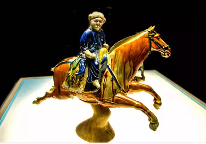 于西安西郊出土,馬全身赭黃色,間白斑紋,鬃、尾、蹄、人足都是白色,轡、鞍、韉都是藍(lán)色,鞍騎一身著藍(lán)色長袍的胡人,奔跑的動感十足,令人驚嘆。