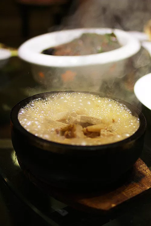 待湯汁落幕,才能看到石鍋里的真面目,老豆腐、河蚌肉、薄五花。。內容豐富。