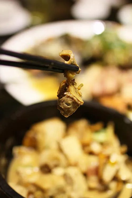 石鍋河蚌老豆腐。超級有意思的吃法,燒得火熱的石鍋端了上來,隨后而到的是一碗冒著熱氣剛剛出鍋的老豆腐,食客矚目,一碗老豆腐傾入石鍋中,瞬間魚眼泡翻滾熱氣四溢,食欲跟著一起沸騰起來。