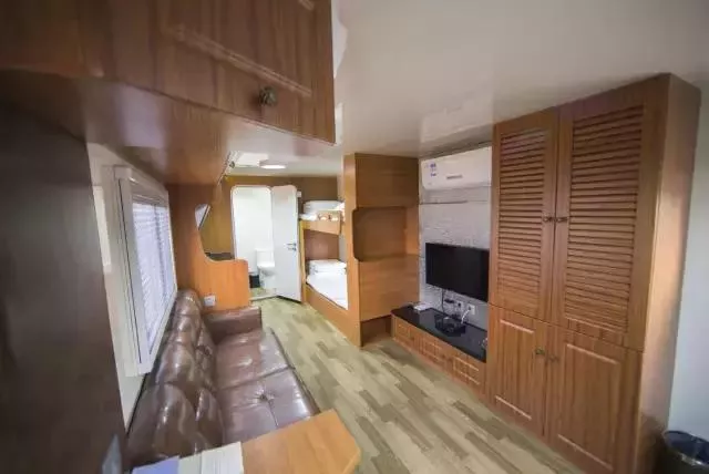 ▲房車(chē)內(nèi)部裝修精良,設(shè)有雙人大床、上下小床、網(wǎng)絡(luò)、冰箱、電視、獨(dú)立衛(wèi)生間、淋浴間等一應(yīng)俱全