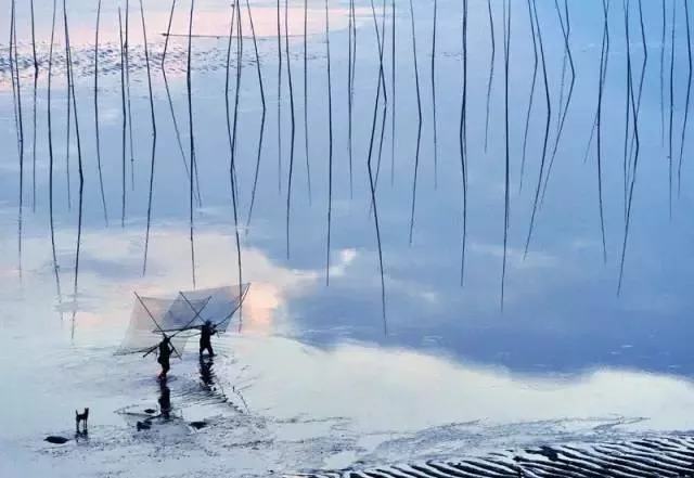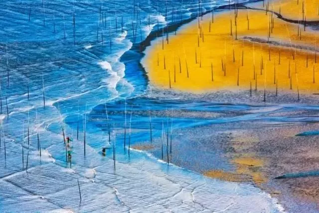 密密麻麻插滿了用來晾曬紫菜的的竹竿