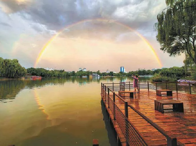 2021年8月26日傍晚,一場(chǎng)陣雨過(guò)后,京城上空雙彩虹高掛,在紫竹院公園,天邊的彩虹與水中的倒影勾勒出一幅秋天的浪漫童話。(方非)