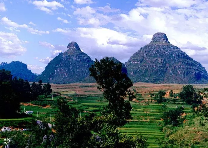 貞豐雙乳峰被稱為“天下奇觀”、“地質(zhì)絕品”,離縣城9公里,處于貴州省貞豐縣城到者相鎮(zhèn)的公路干線上。占地40公頃,海拔1265.8米,相對(duì)高度261.8 多米,酷似一對(duì)栩栩如生、形象逼真、風(fēng)韻圓潤(rùn)的雙乳。讓女人看了臉紅,男人看了心跳,被當(dāng)?shù)夭家雷宸Q為“圣母峰”,被世人譽(yù)為“天下第一奇峰”雙乳峰。更為出奇的是,從不同的角度觀看,是不同年齡階段的雙乳形狀。如,從觀峰臺(tái)的角度看,是20來(lái)歲年齡的雙乳峰,換500米角度觀看是40來(lái)歲年齡的雙乳峰,再換500米角度觀看是60歲年齡的雙乳峰,真是大自然的鬼斧神工。