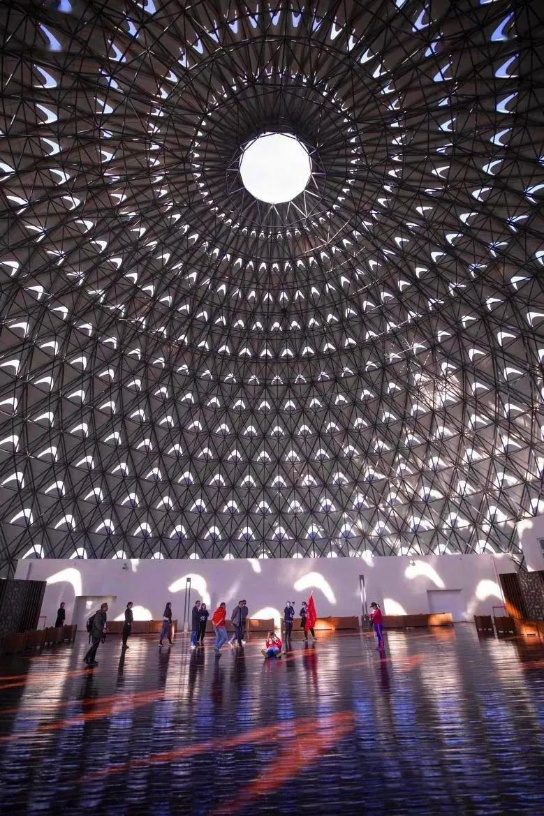 在建筑基座周?chē)芯离h秀的56個(gè)花瓣式門(mén)洞形成的柱廊空間,象征56個(gè)民族團(tuán)結(jié)共榮。藍(lán)天白云下,白色為主體的建筑物在陽(yáng)光下顯得更加絢麗,不愧是網(wǎng)紅打卡地。