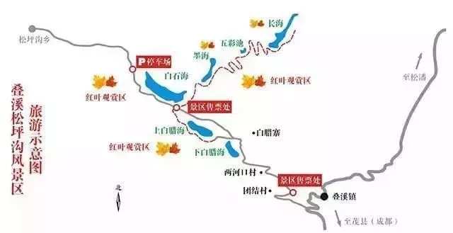 (1)成都到松坪溝全程約218公里,途經(jīng):成都→(成灌高速都江堰→(都汶高速)映秀→(映汶高速)汶川→(G213)茂縣→(松坪溝景區(qū))。