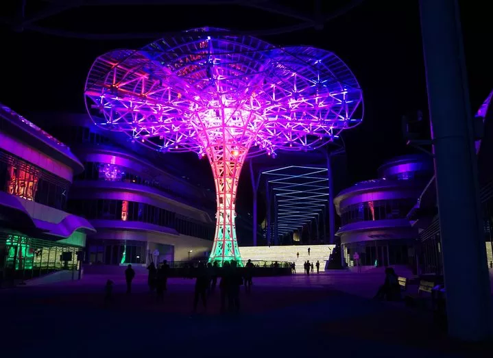 雖然是完完全全的人造小鎮(zhèn),但現代感和科技感十足的渲染下,反倒顯得這個山里小鎮(zhèn)很是前衛(wèi)。夜晚燈火輝煌,光彩奪目,沒有了白天里明晃晃的日光,五彩斑斕的霓虹燈讓天文小鎮(zhèn)有著另類的風情。