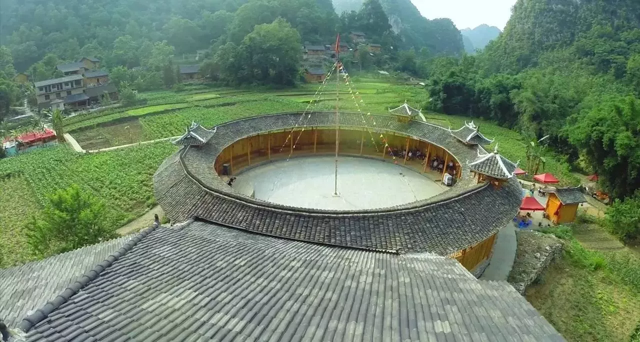 位于格凸河伏流中段山上的竹林寨,距大穿洞口約1.5公里。這里居住的是高山苗族,以吊角樓著稱,還有四柱落腳的“半笠”糧倉如蘑菇一樣散落在林中。