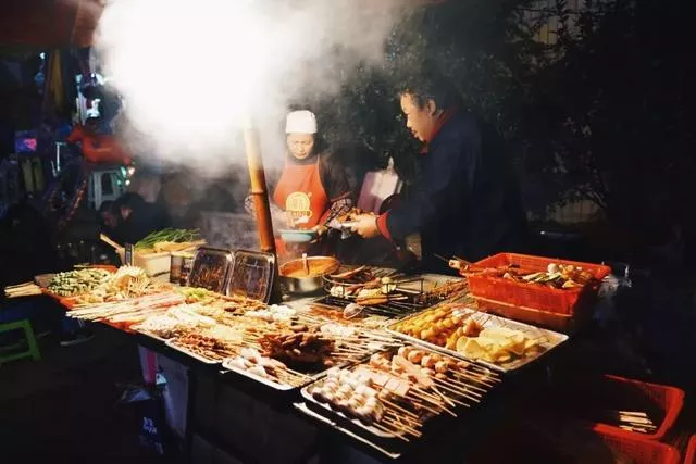 作為一個生在小河長在小河的人,第一個要推薦的就是最富有回憶的美食。莽叔叔燒烤就用這樣老式推著走的攤子做了20年,到今天也是一樣。每天圍著攤子的人看著或許不多,那是因為全是老熟客會提前打電話點菜,桌子上的紅簍子就是在排隊,所以有可能你去的時候只有兩三個人在,但是卻需要等七八位