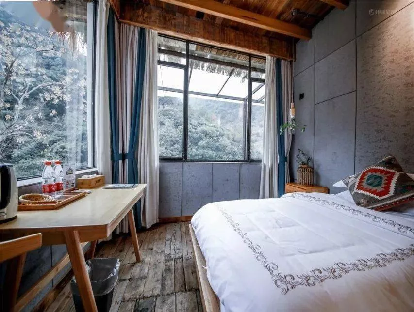 轉(zhuǎn)到房間內(nèi),是清新的木質(zhì)感,透過窗戶,是山水浸潤,退回室內(nèi),是舒爽和便利,還有小小天窗,伸出手,在這個(gè)人間仙境,似乎距離星空又近了一些……