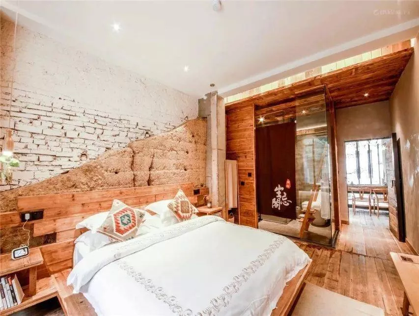在藏書閣隔壁的一棟單獨(dú)的建筑,是民宿部分,三層建筑,房間墻面風(fēng)格順延了整個(gè)建筑的風(fēng)格,做成了土墻青磚。